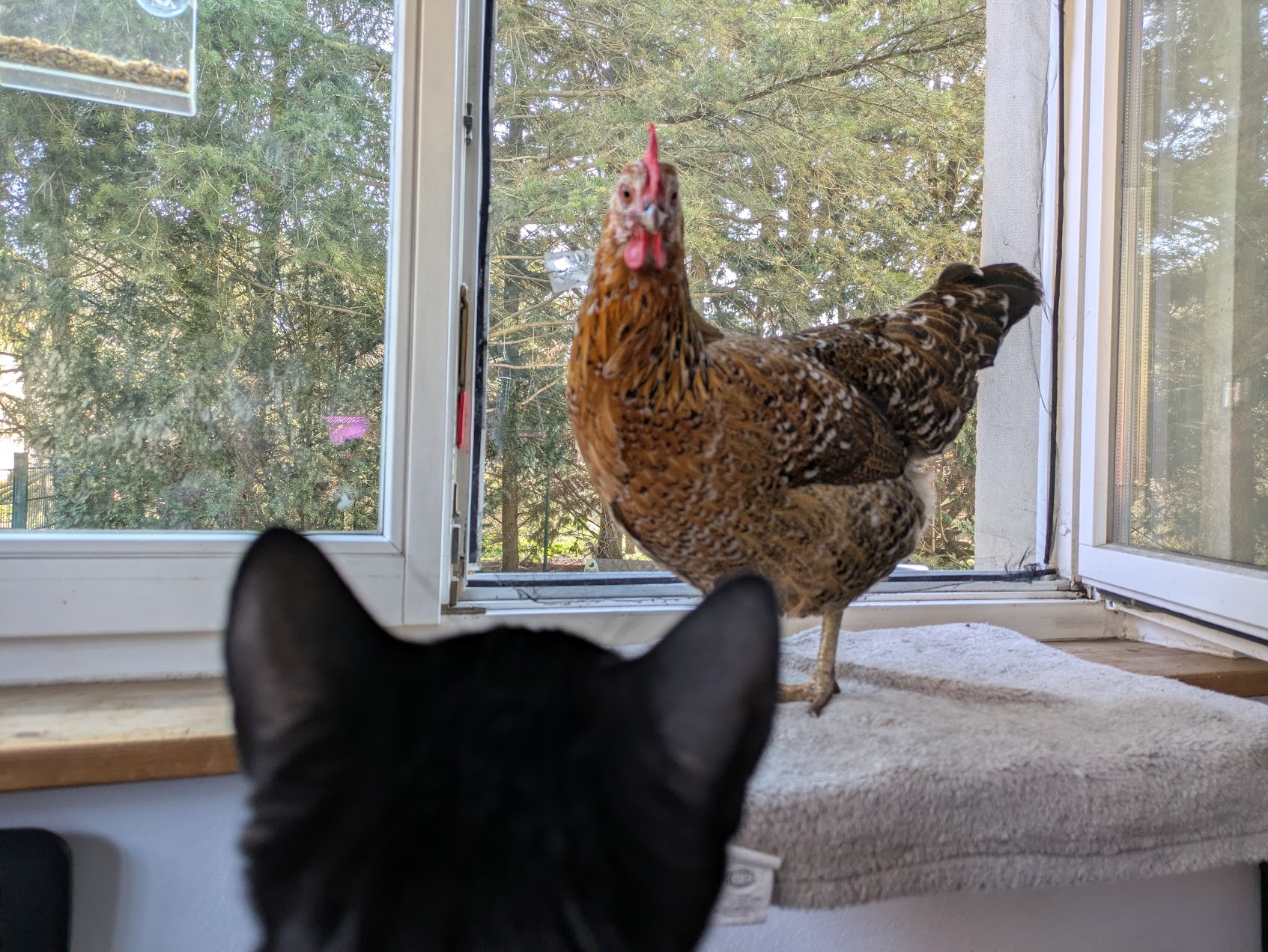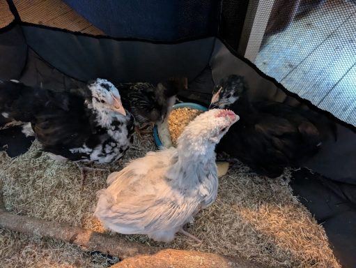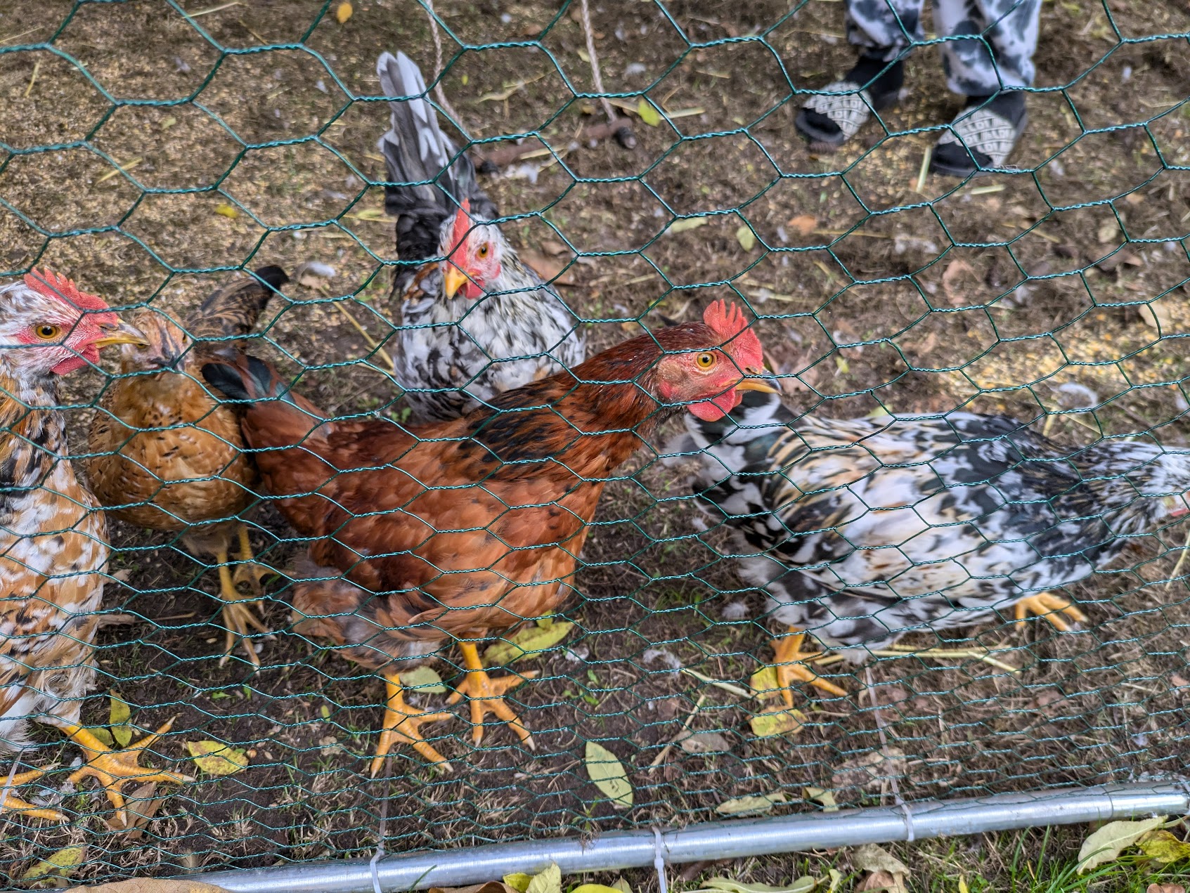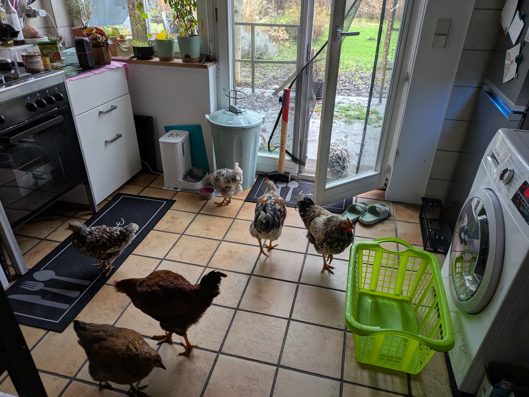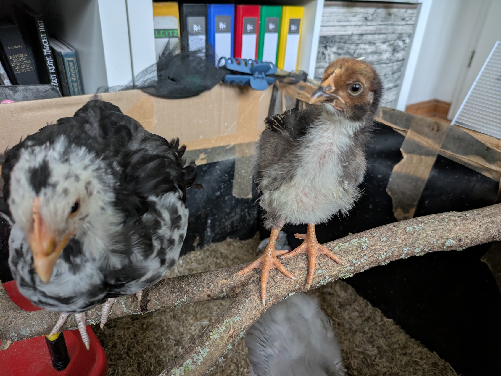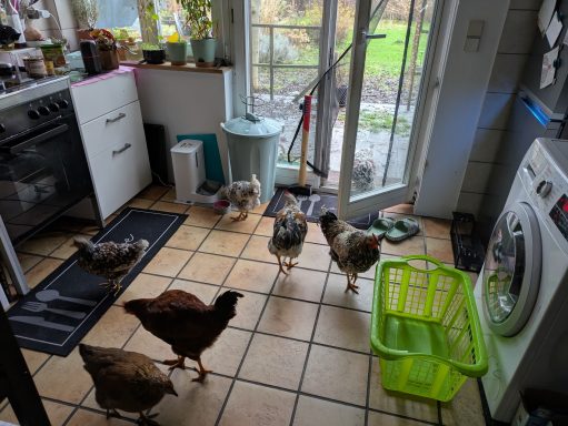 Bei uns werden alle Hühner von Hand im Haus aufgezogen. Sie sind damit auch im Erwachsenenalter handzahm und zutraulich - manchmal vielleicht etwas zu sehr... ;-)