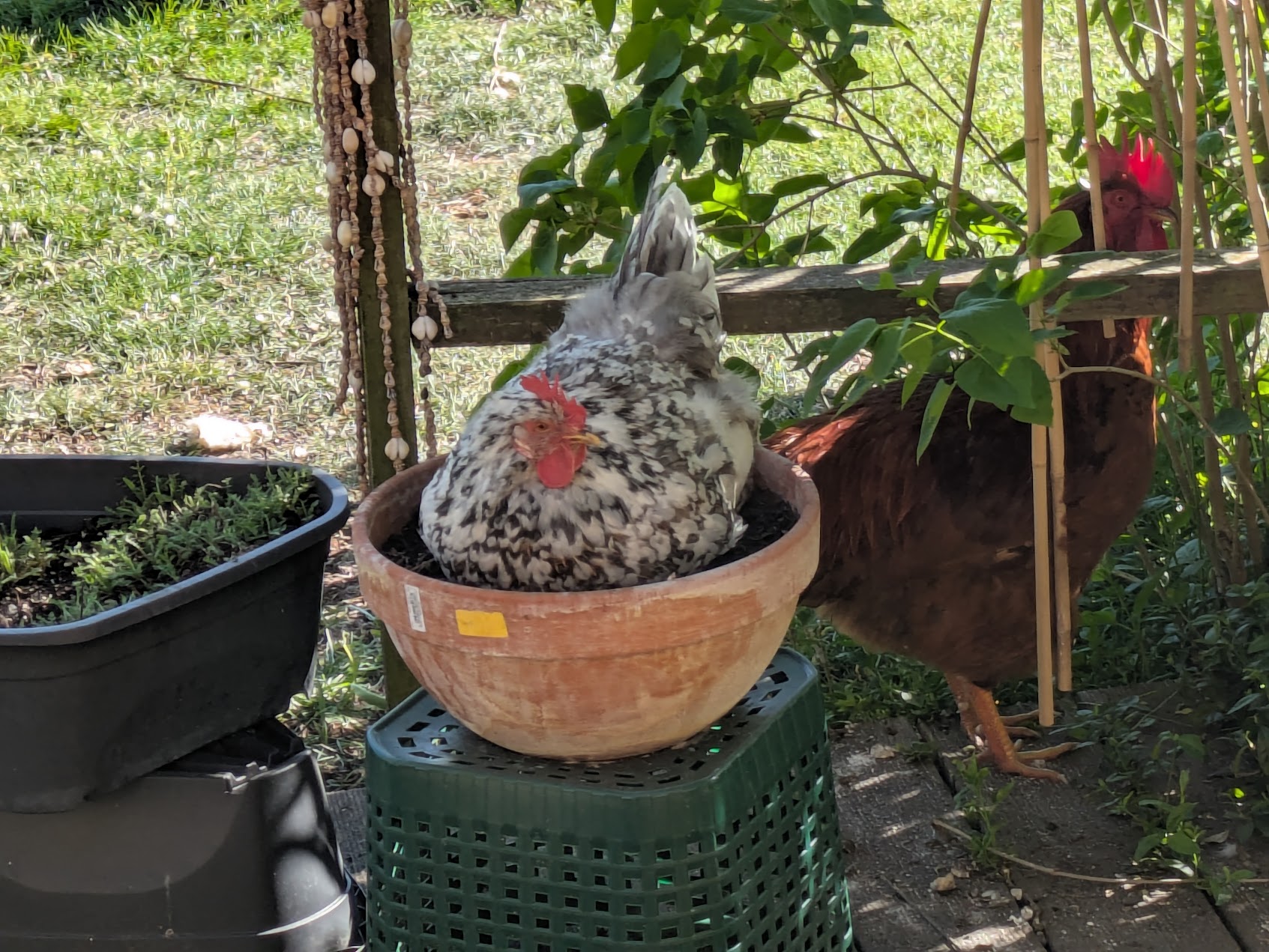 Alle Hühner, egal ob im Stall oder auf der Wiese, sollten immer ein Sand- oder Staubbad zur Verfügung haben. Eine Katzentoilette mit Sand reicht hier oft schon hin!